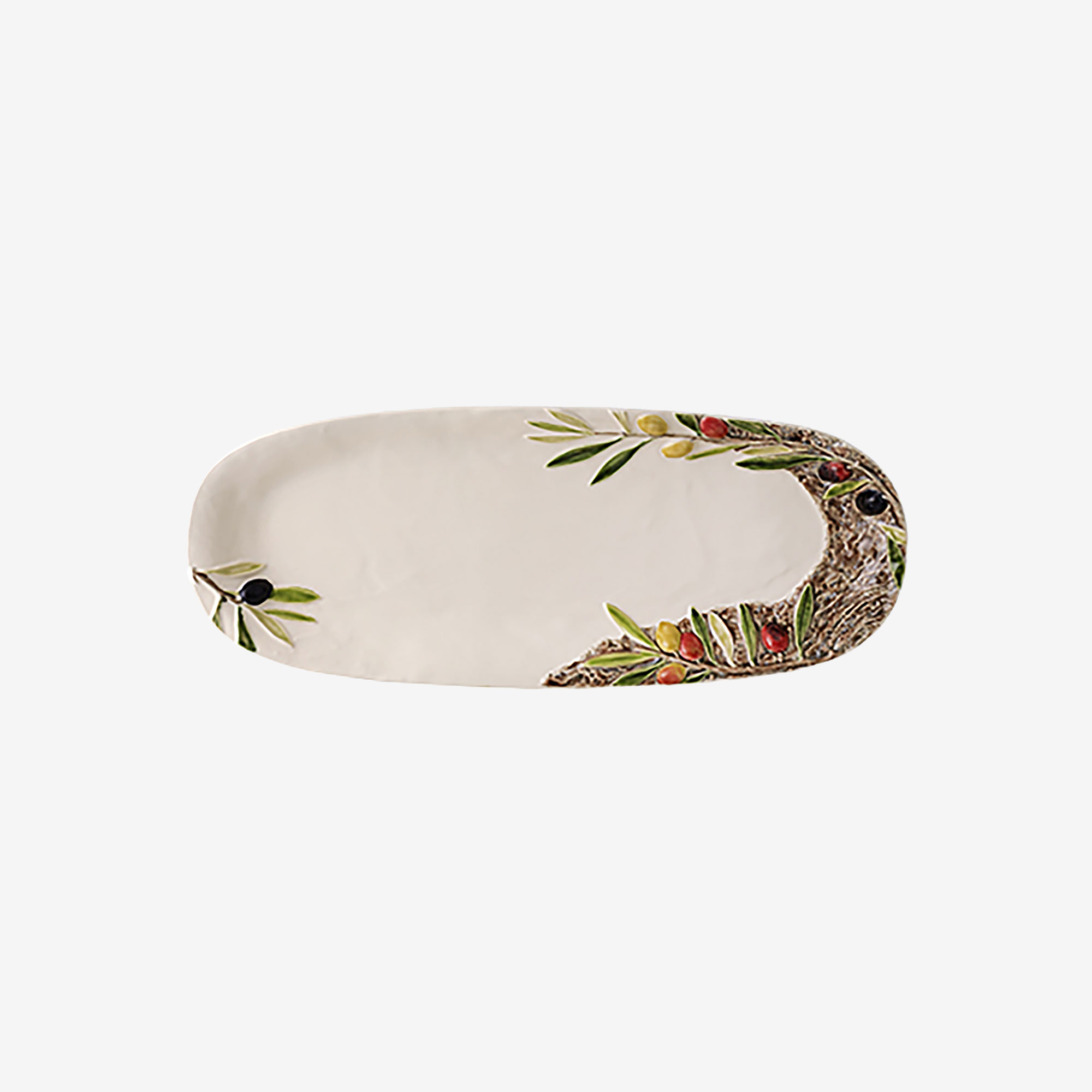 Rustik bilgelik ve güzellikle dolu bu büyüleyici ortam, hem parçaların beyaz yüzeyi hem de badana kaplamayı aslına sadık kalarak çağrıştıracak şekilde özel olarak tasarlanmış dokularıyla temsil ediliyor. Beyaz yüzeyin üzerinde zeytin ağacının dalları, farklı dokulara sahip gövdesi veya farklı olgunluk tonlarında zeytinler gibi unsurları yer alıyor; tamamı elle boyanmış seramik kabartma.