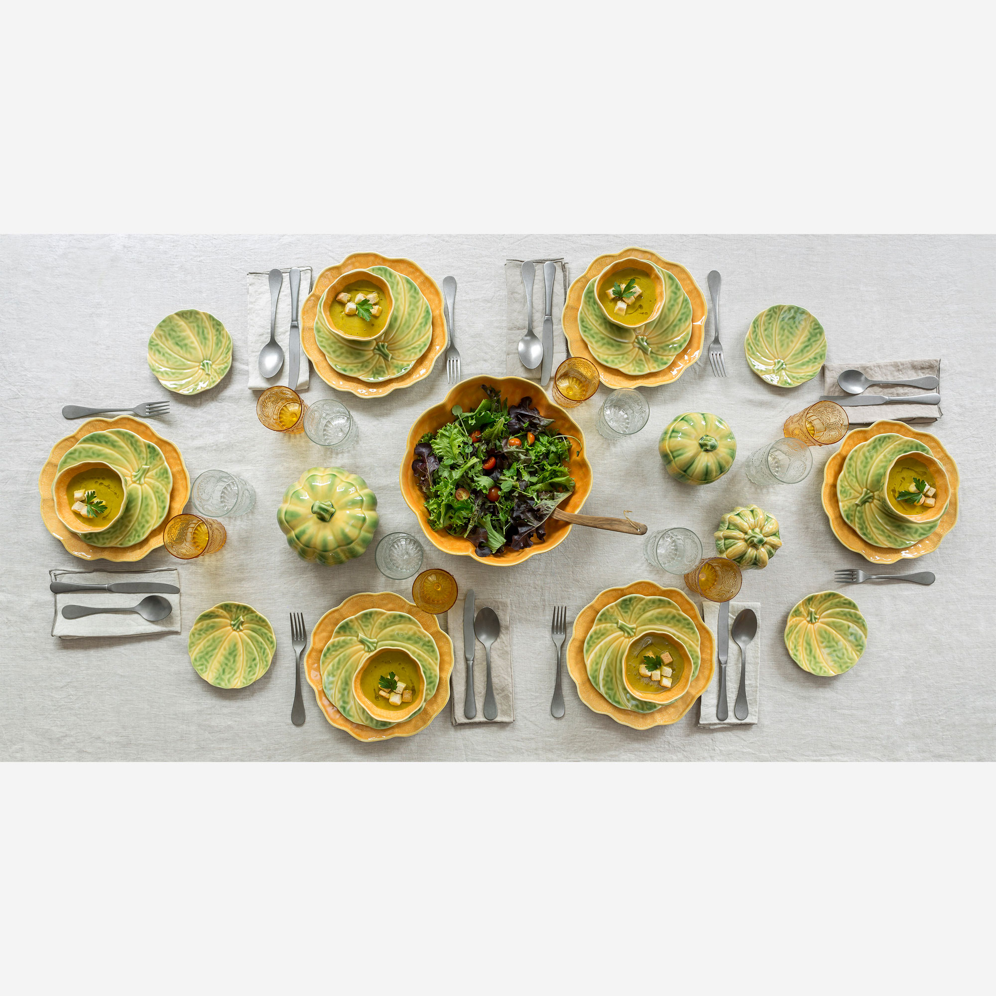 Bordallo Pinheiro'nun en ikonik dekorasyonlarından biri olan balkabağı terrinesi temel alınarak, dünya mutfağının ekslibrisini büyük bir canlılıkla kopyalayan bir masa serisi ve servis eşyaları geliştirildi.