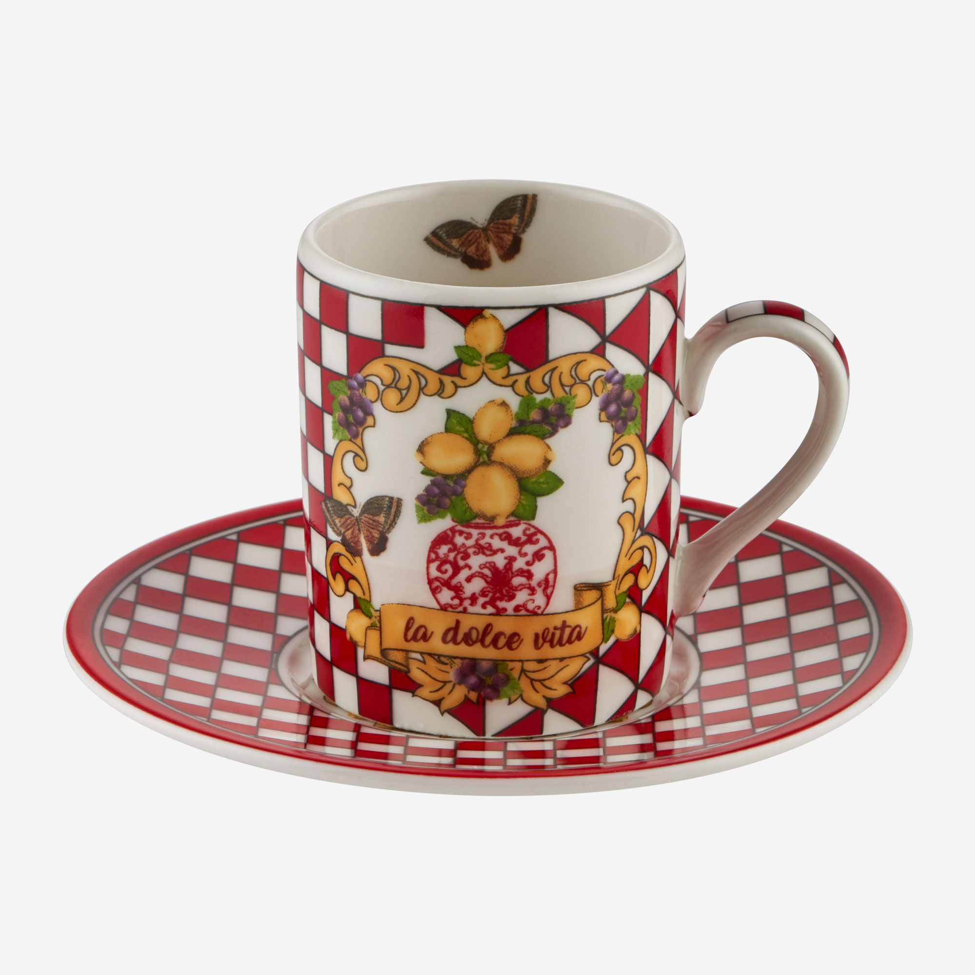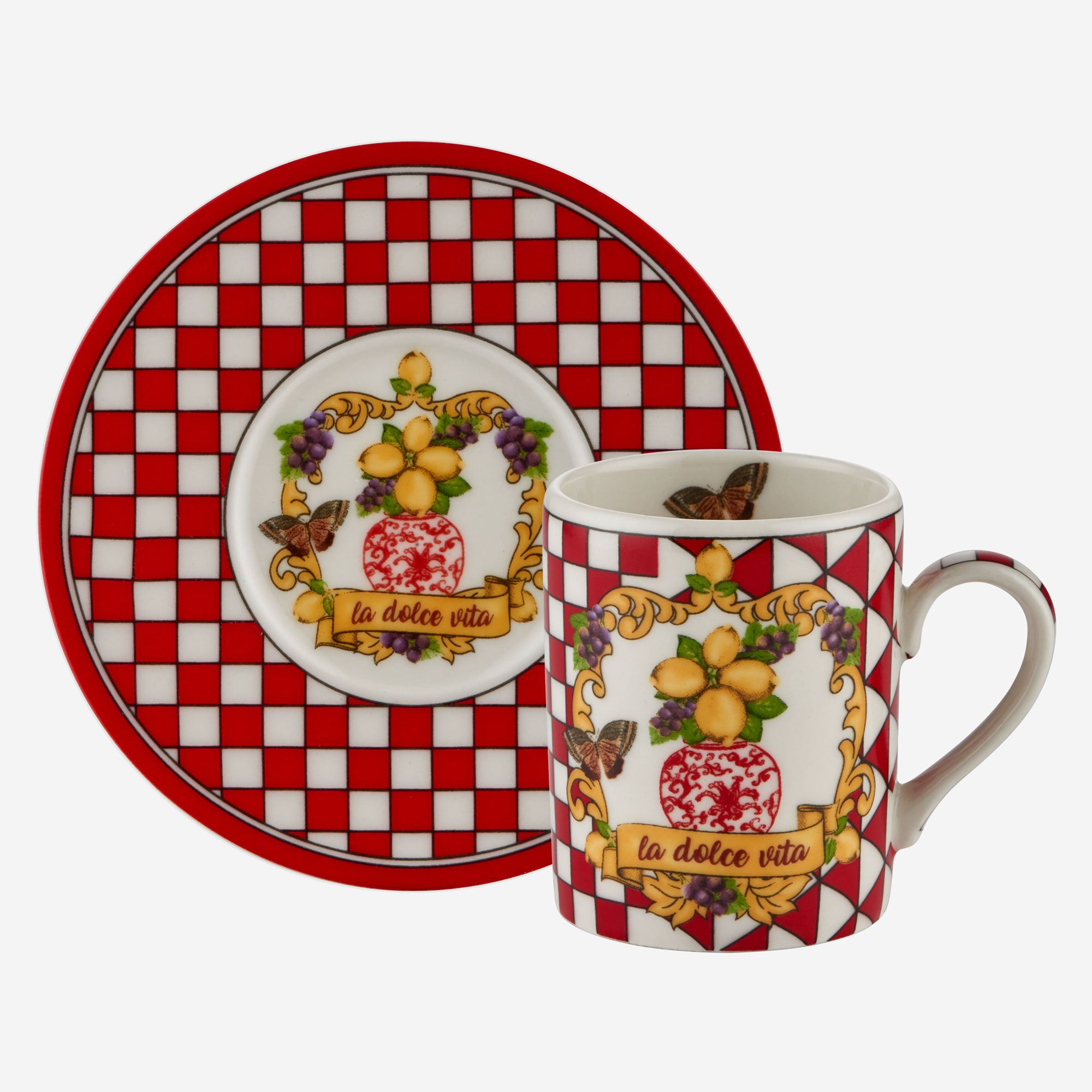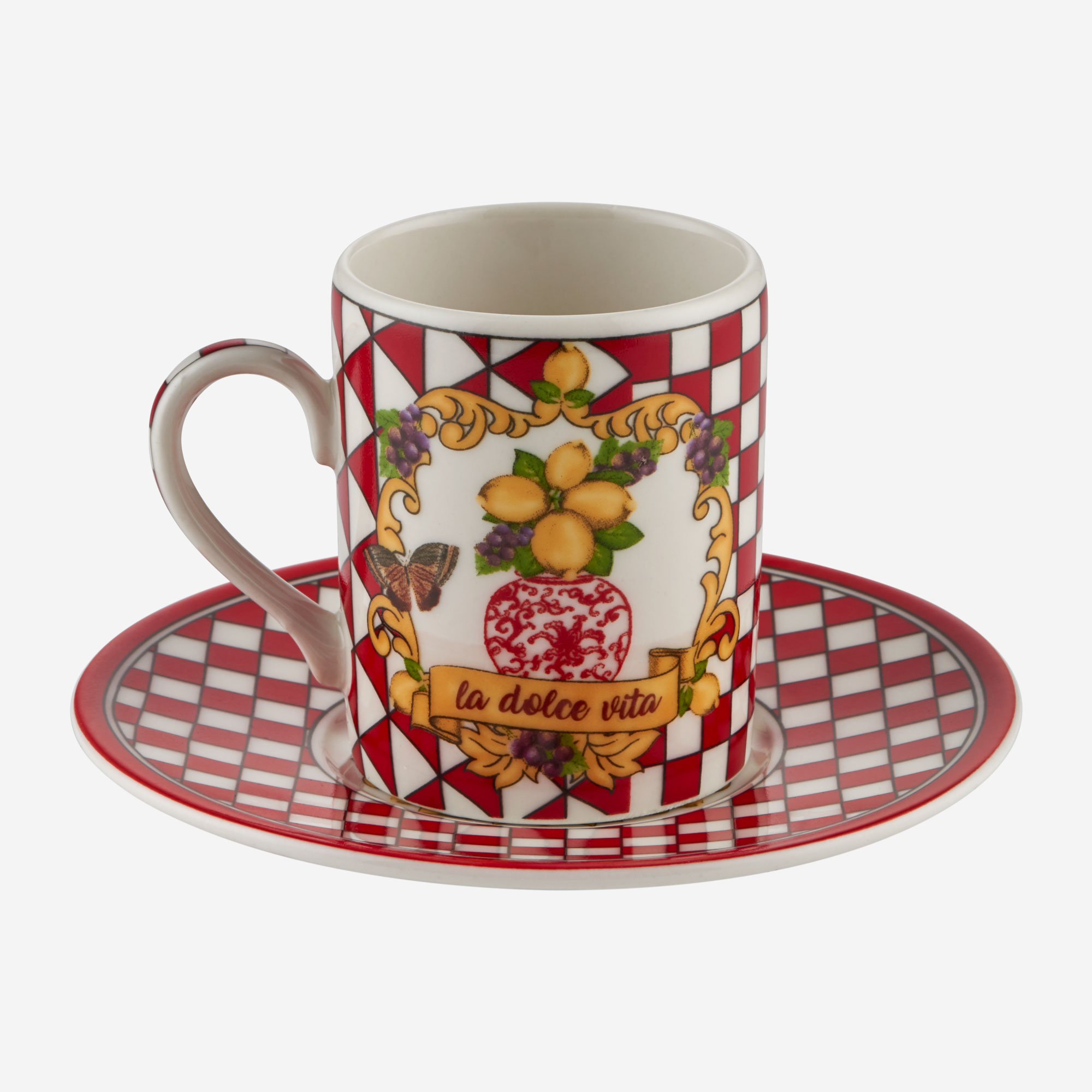 Chiara Alessi Capri Koleksiyonu’nun bu göz alıcı kırmızı fincan seti ile kahve keyfinize İtalyan şıklığını taşıyın. Canlı kırmızı-beyaz dama desenleri, barok süslemeler ve ferahlatıcı limon motifleriyle bezeli bu tasarım, ""La Dolce Vita"" yani tatlı hayatın enerjisini sunumlarınıza yansıtıyor.