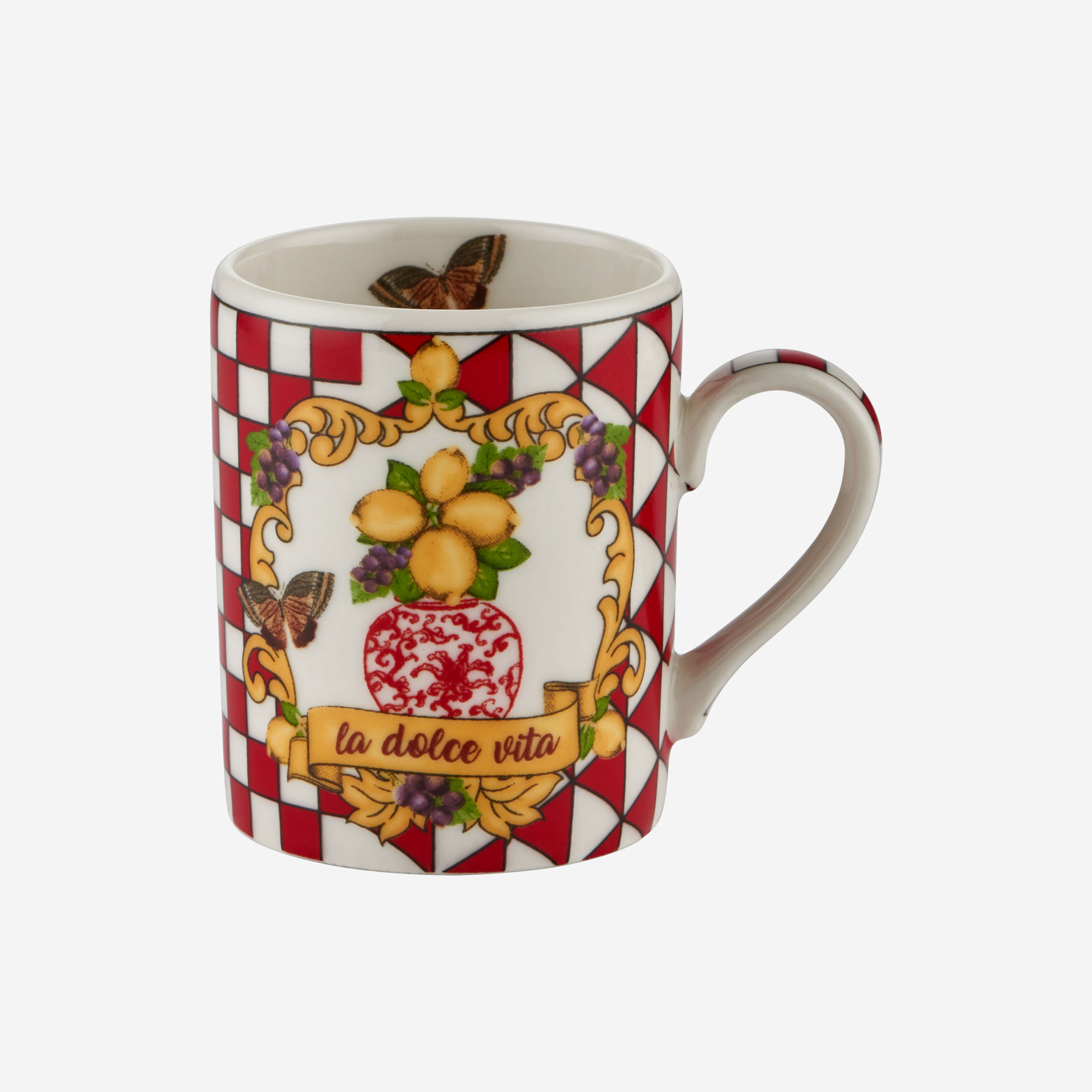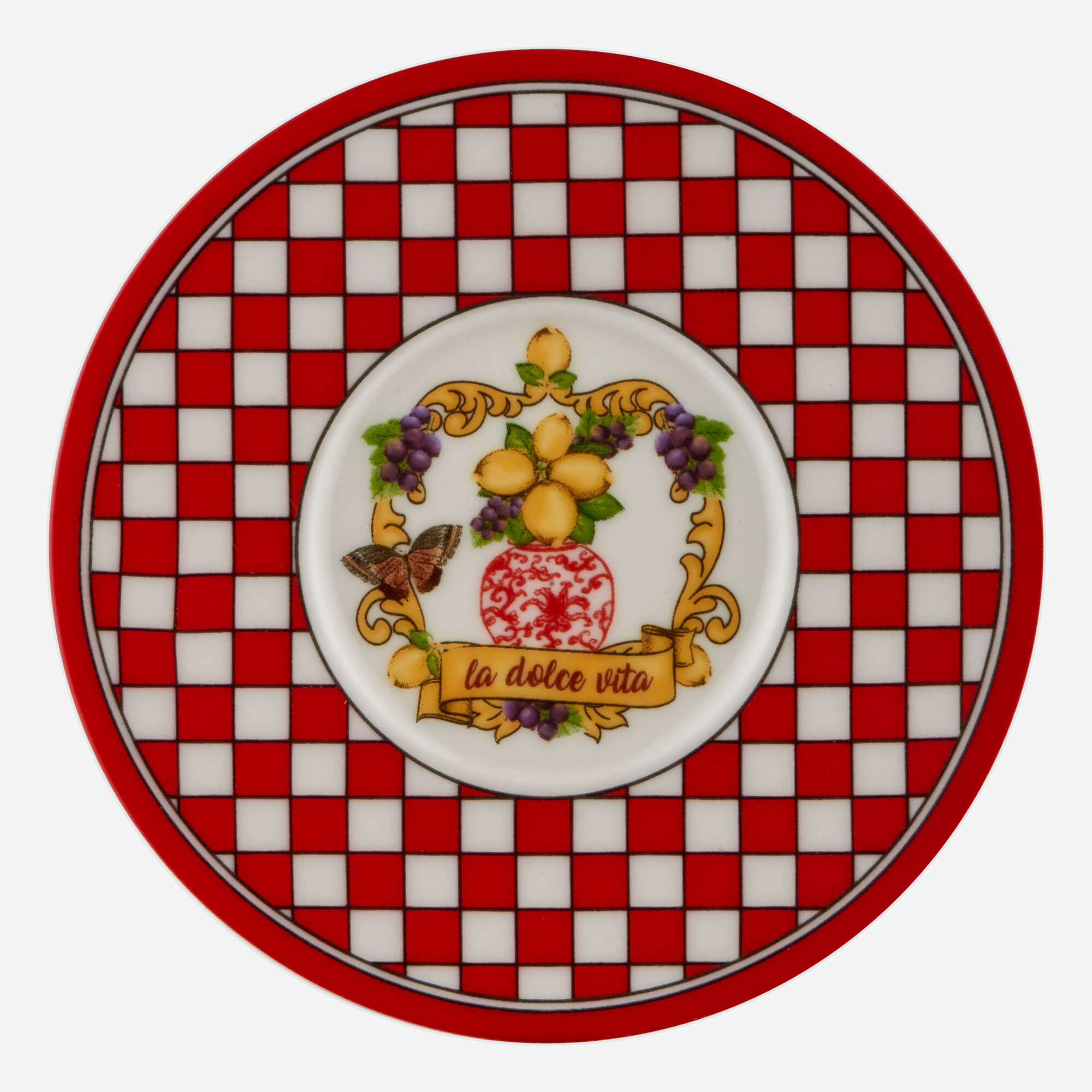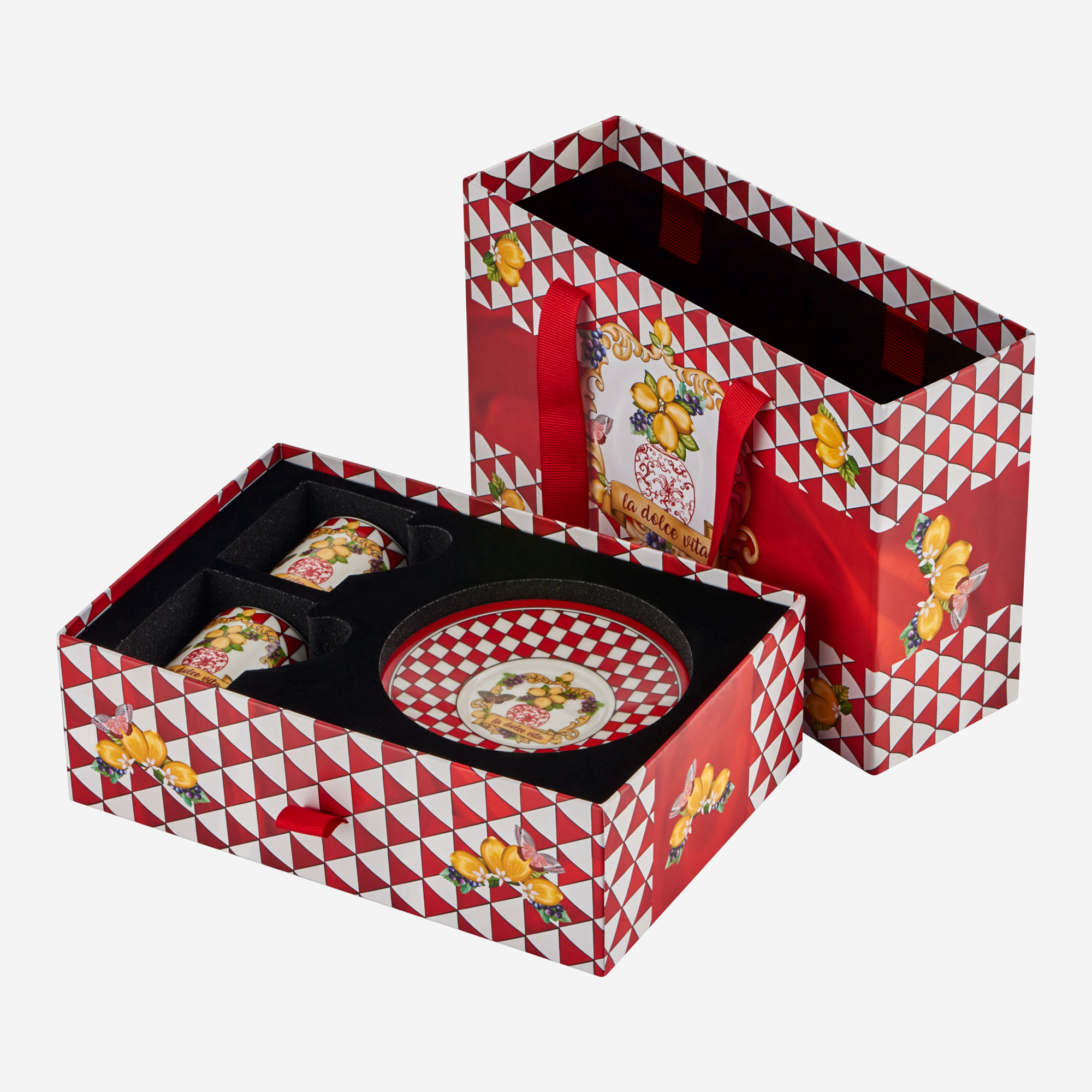 Chiara Alessi Capri Koleksiyonu’nun bu göz alıcı kırmızı fincan seti ile kahve keyfinize İtalyan şıklığını taşıyın. Canlı kırmızı-beyaz dama desenleri, barok süslemeler ve ferahlatıcı limon motifleriyle bezeli bu tasarım, ""La Dolce Vita"" yani tatlı hayatın enerjisini sunumlarınıza yansıtıyor.