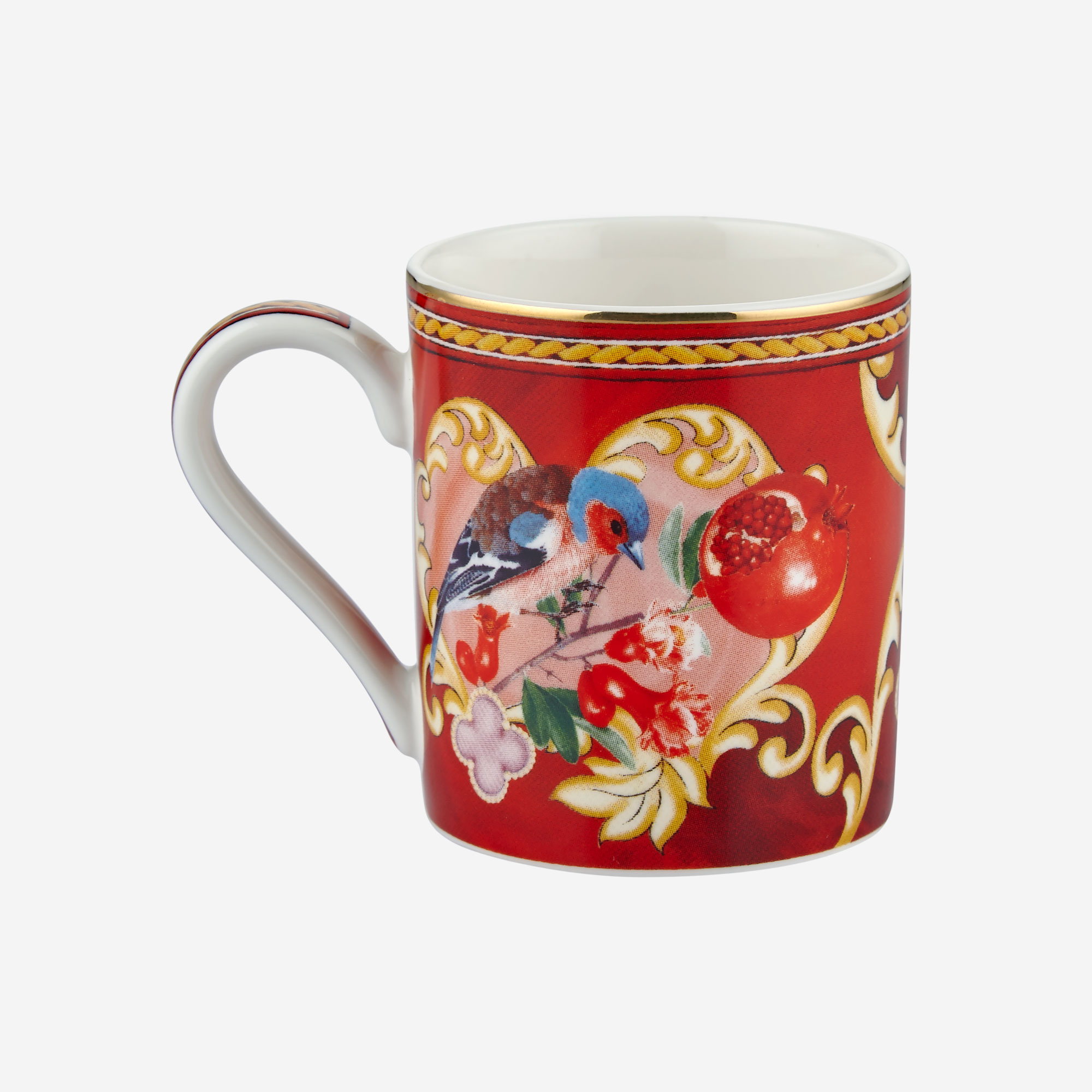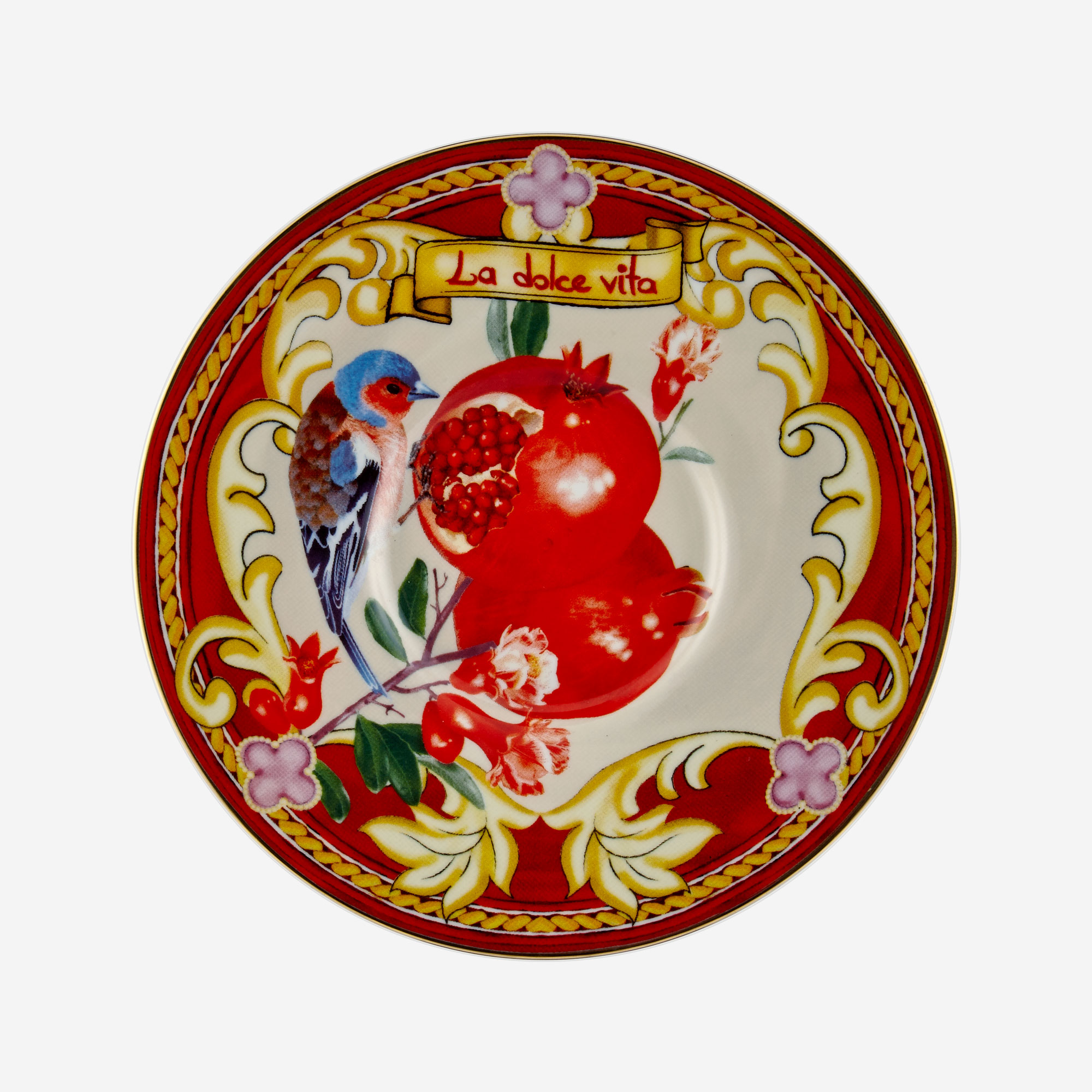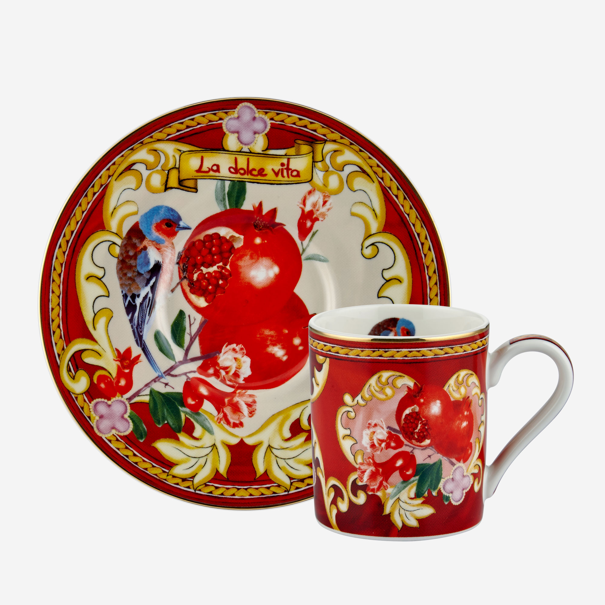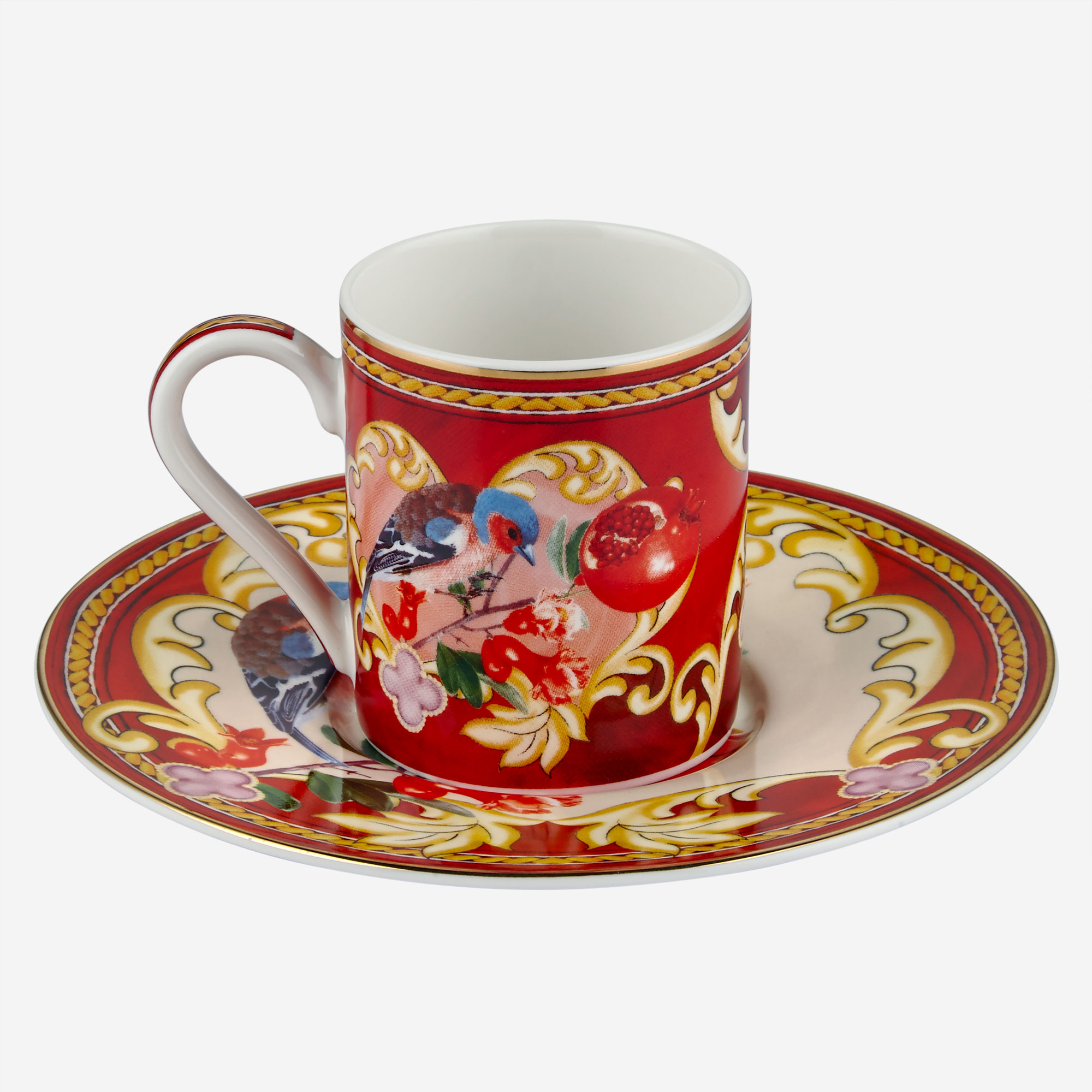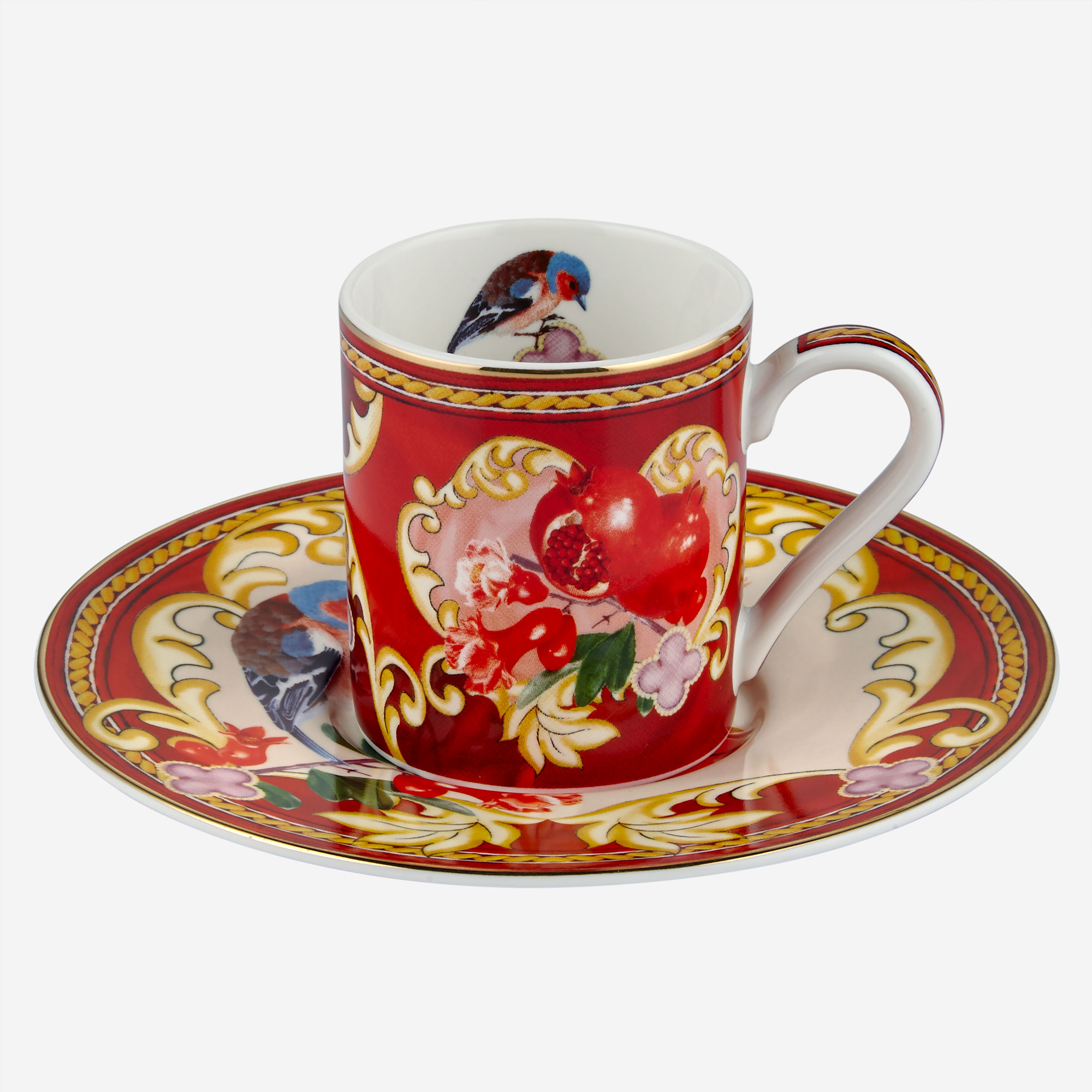 Chiara Alessi Capri ile çiçek bahçeleri sofralarınıza geliyor. Kırmızı üzerine nar ve kuş desenleri ile kendisine hayran bırakacak porselen kahve fincan setini çok seveceksiniz.