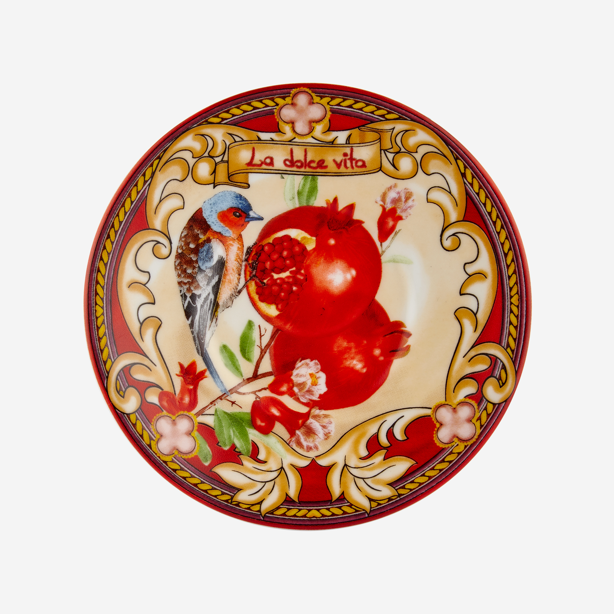 Chiara Alessi Capri Metal Kutulu Türk Kahvesi Fincanı, kırmızı ve bej tonları üzerine resmedilen nar simgesiyle dikkatleri üzerine çekiyor. Binlerce yıldan beri birçok kültürde Nar, bolluk ve bereket simgesi olarak kullanılmıştır. Capri Türk Kahvesi Fincanını tasarlanırken, sofralarınıza bolluk ve bereket getirmesi amaçlanmıştır. Metal Kutulu İkili fincan seti, şık kutusuyla sevdiklerinizin mutlu edecek harika bir hediye seçeneğidir.
