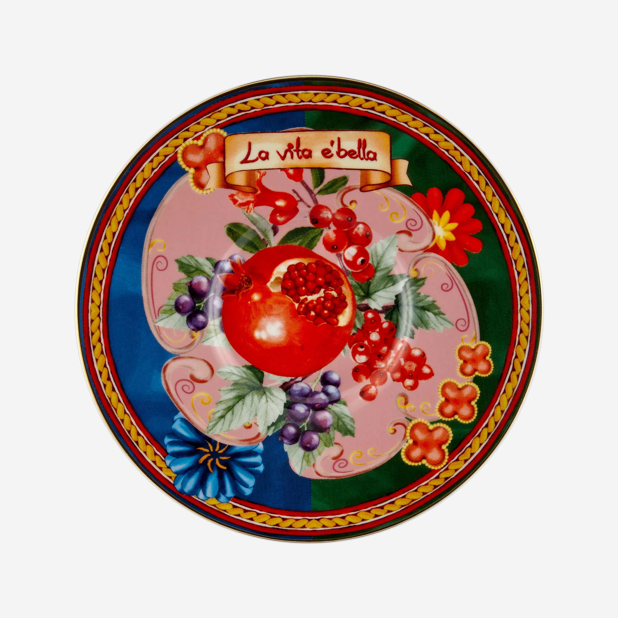 Chiara Alessi Capri ile çiçek bahçeleri sofralarınıza geliyor. Mavi / yeşil üzerine nar ve kuş desenleri ile kendisine hayran bırakacak porselen kahve fincan setini çok seveceksiniz.