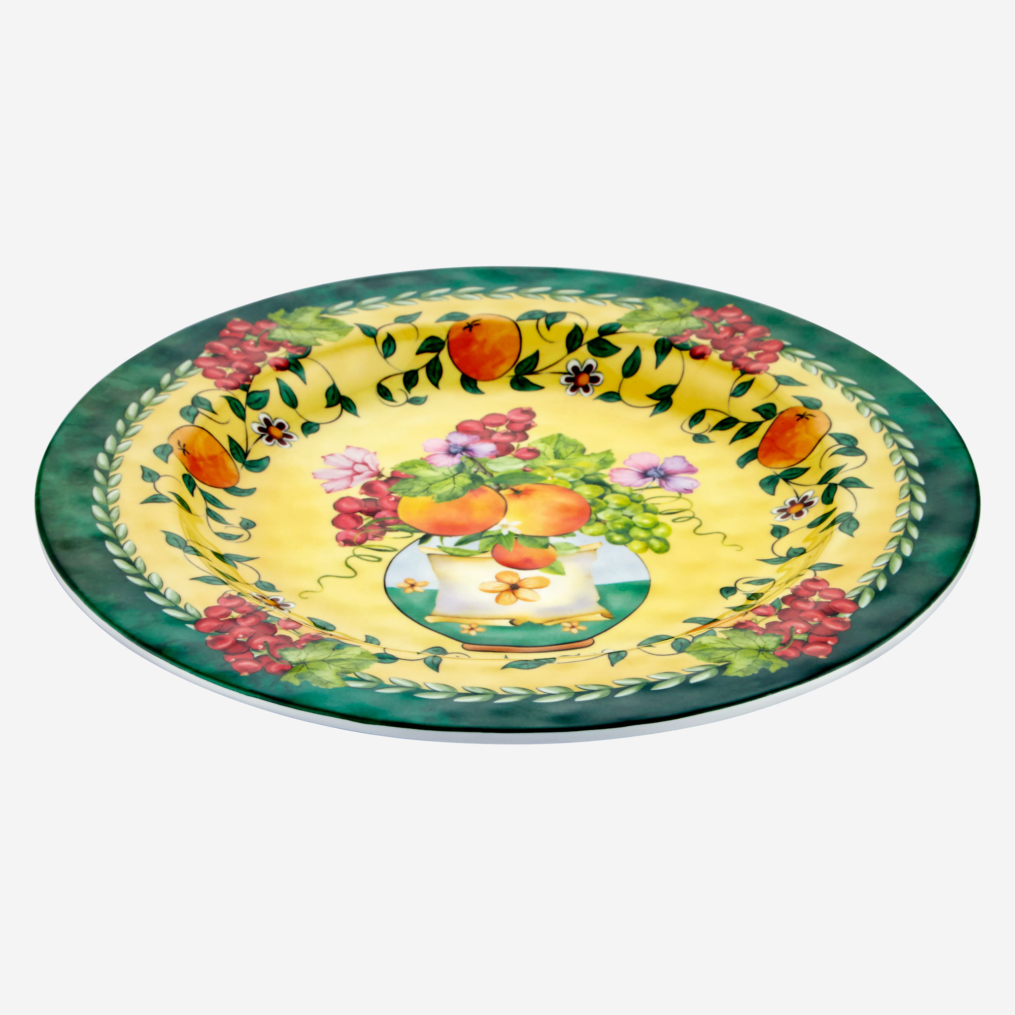 Chiara Alessi Carpe Diem sarı bir arka plan üzerine frenk üzümü, portakal ve çiçeklerle dekore edilen yeşil melamin yemek tabağı uzun süreli kullanım için tasarlanmış, kırılmaya ve çizilmeye karşı ekstra dayanıklıdır ve BPA içermez.